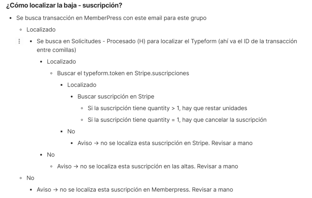 Esto es una nota literal de un proceso que automaticé hace varios años en una academia de danza que trabajaba con MemberPress, Typeform, Stripe y WordPress (entre otras) y que se encargaba de gestionar la baja de una suscripción. Una pequeña pieza de todo el sistema que estábamos montando.